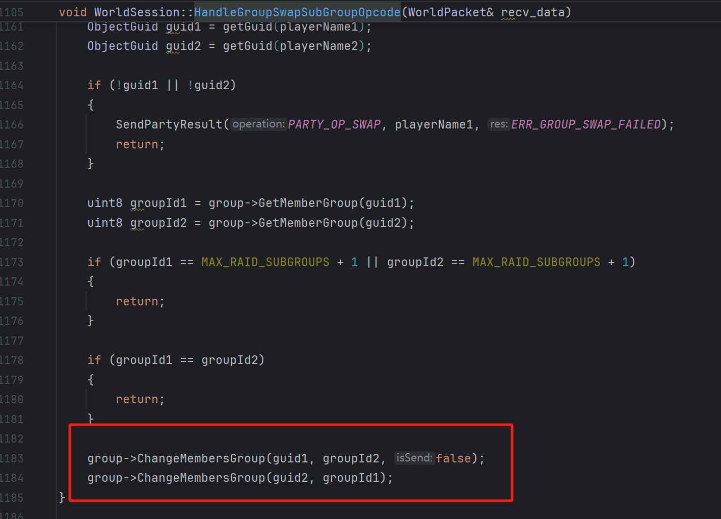 以下以az核心(azerothcore)代码为例,当一个团队中,不同的团队成员互换位置的时候,客户端会向服务器发送 “CMSG_GROUP_SWAP_SUB_GROUP” 协议,然后服务器收到之后应该返回调整之后的 “SMSG_GROUP_LIST” 协议